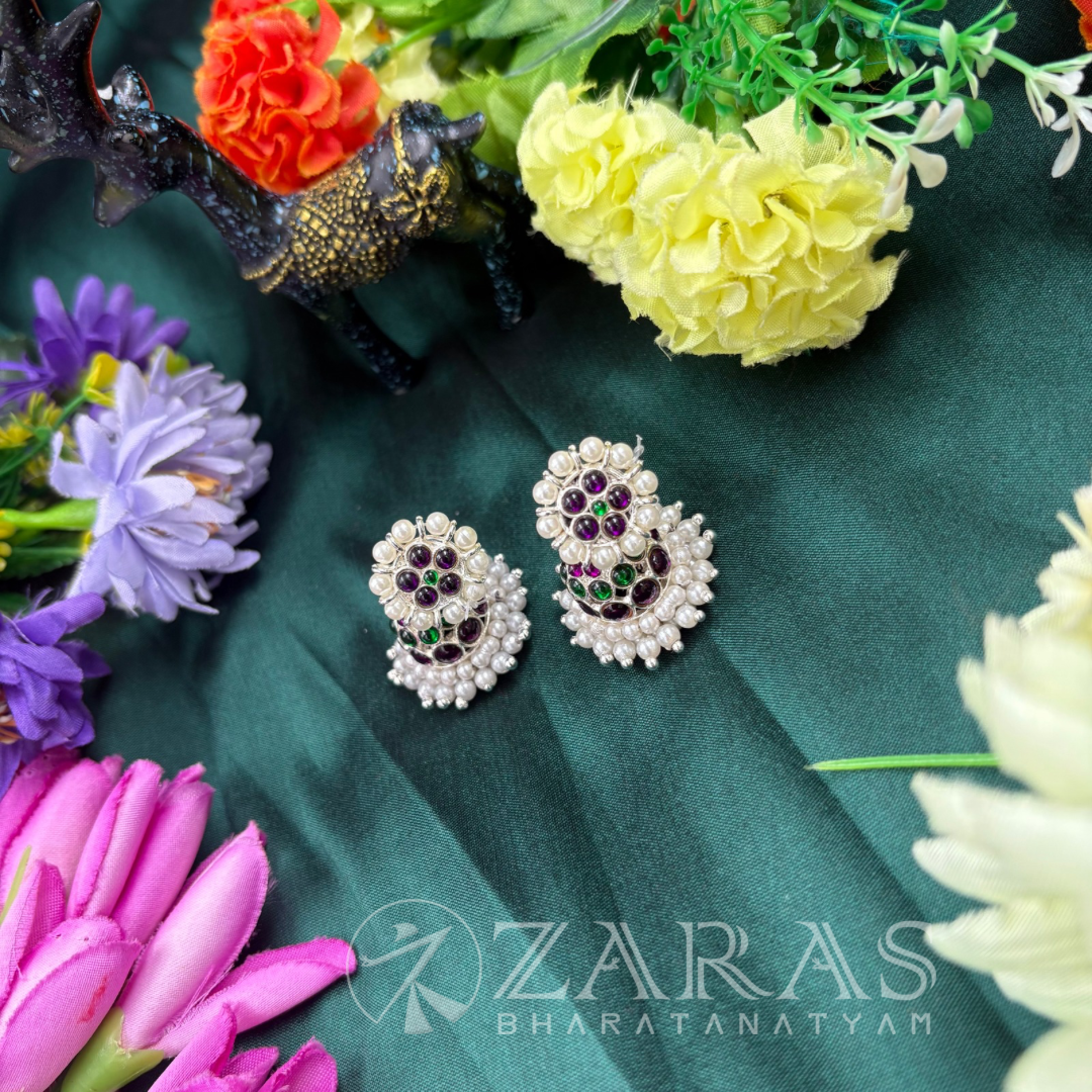 Earrings (thodu or kammal) are an integral part of a dance performance. From dance classes to the stage, a thodu accompanies the dancer. Despite the artform be it Bharatanatyam, Kuchipudi or Mohiniyattam, the style or design may change, but the Jhumka remains constant. Heavy earrings, mostly made with green and maroon kemp stones, white stones and pearls are being used, paired with medium-sized maati. Jhumkas are used widely. It increases the beauty of the dancer as well as the dance.