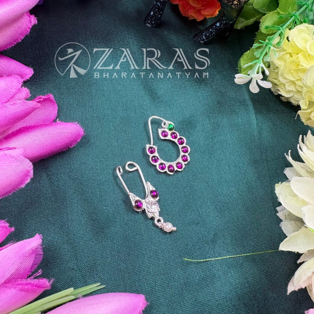 Nathu Bullaku, Mooku Kuthi, Mooku Valayam, and Mooku Pillaku are three ornamental pieces worn on either side and at the centre of the nose. These adornments enhance the grace of the dancer.