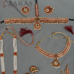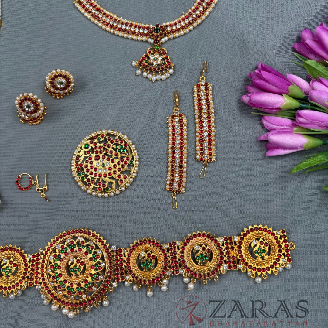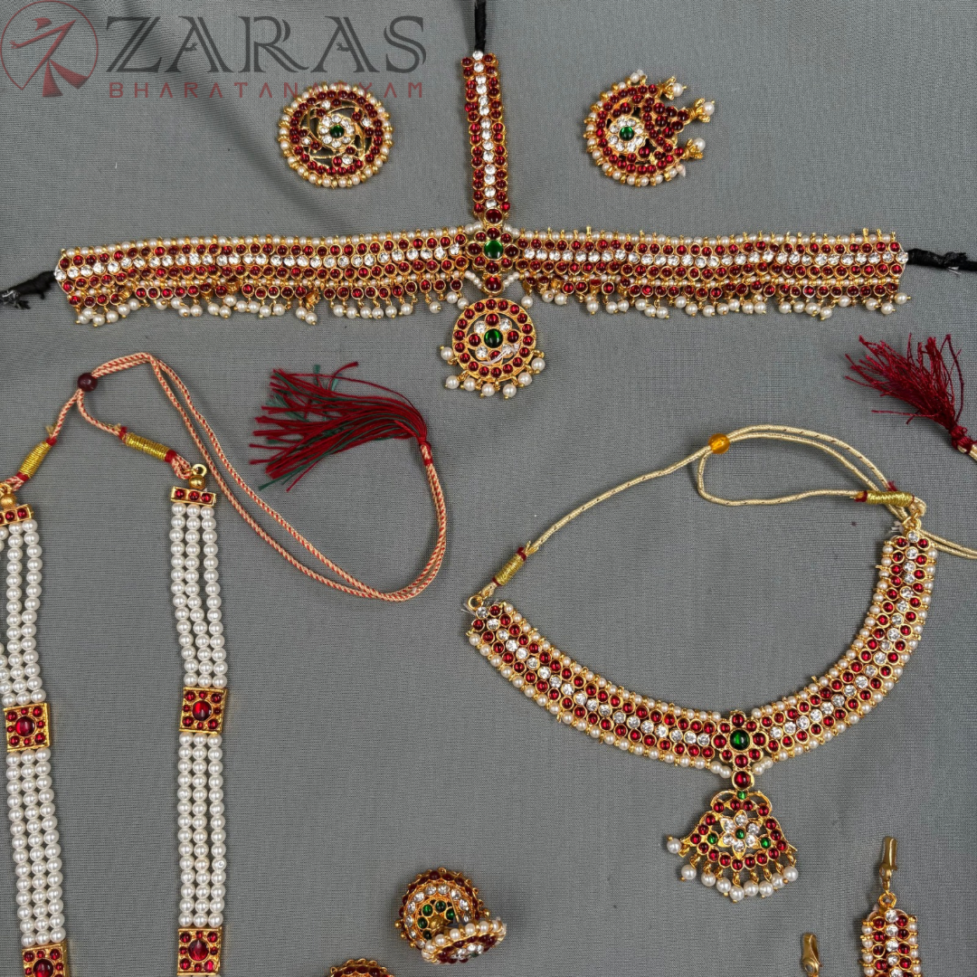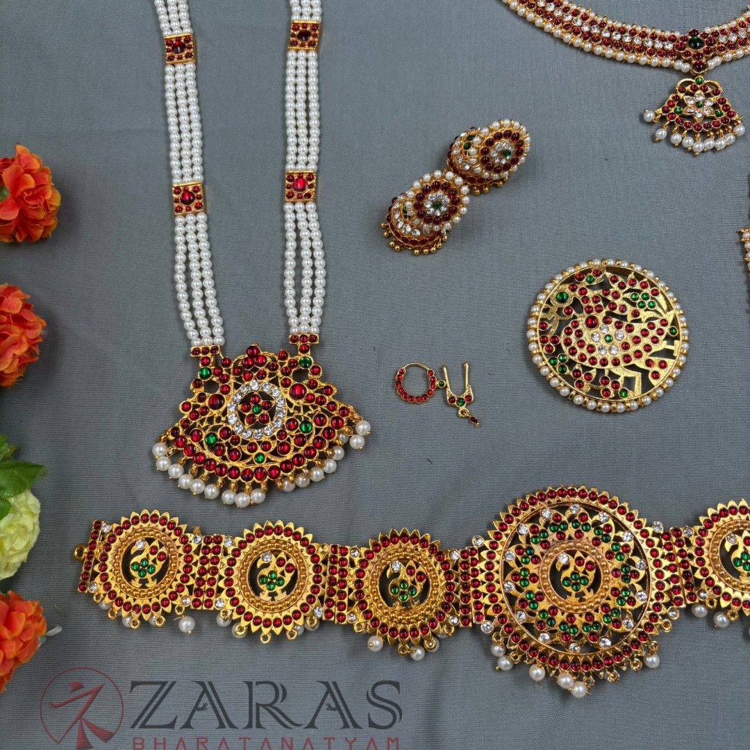 Neckpieces: The neckpieces consist of a short necklace and a long Malai, which are the focal points of the jewellery. The short necklace, known as Attikai, is worn just below the neck and is typically crafted with dark maroon and green stones. The long Malai is made of pearls and stones. It is believed to aid the dancer’s breathing during the performance.
