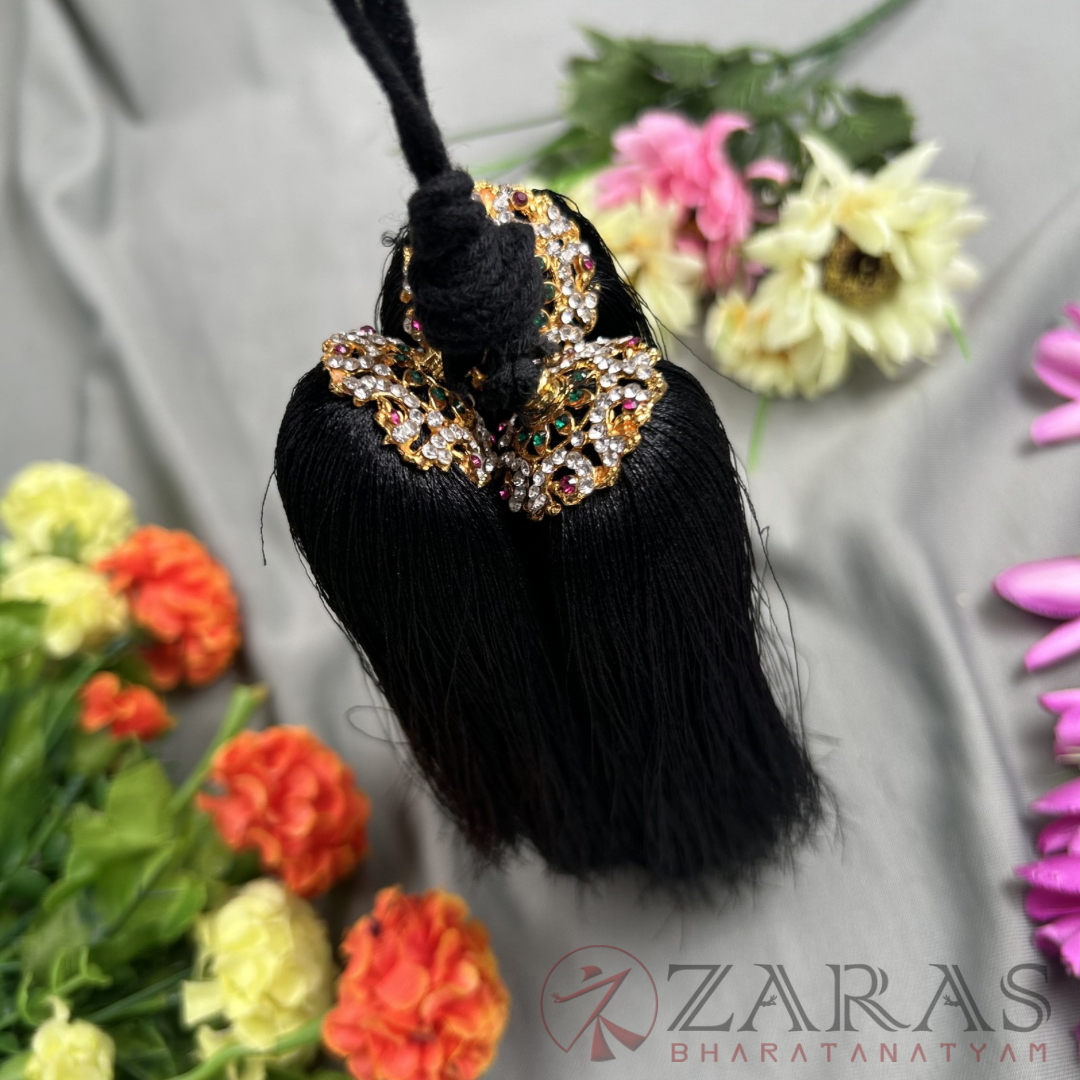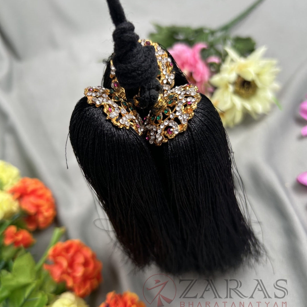 In Bharatanatyam, the Kunjalam is a traditional hair accessory that plays a significant role in enhancing the dancer’s aesthetic appeal, cultural expression, and overall grace. Adorned with pearls, stones, and intricate designs, the Kunjalam adds an elegant touch to the dancer’s hairstyle, completing the visual presentation. It holds cultural importance, symbolizing femininity, grace, and prosperity within South Indian tradition.