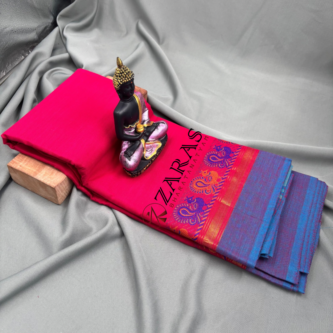 Peacock dance practice sarees are all-time best sellers for their attractive design. The rich border is lined up with motifs of peacocks, followed by a golden zari and a contrast plain border, giving the border a grand and rich aesthetic look. It comes in various colour combinations like red with blue border along with golden and blue coloured peacock motifs, red with green, yellow with red, etc.