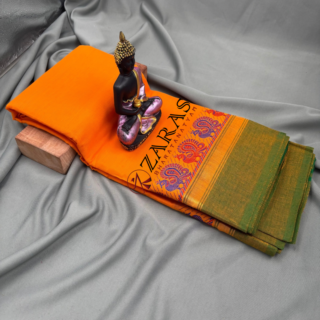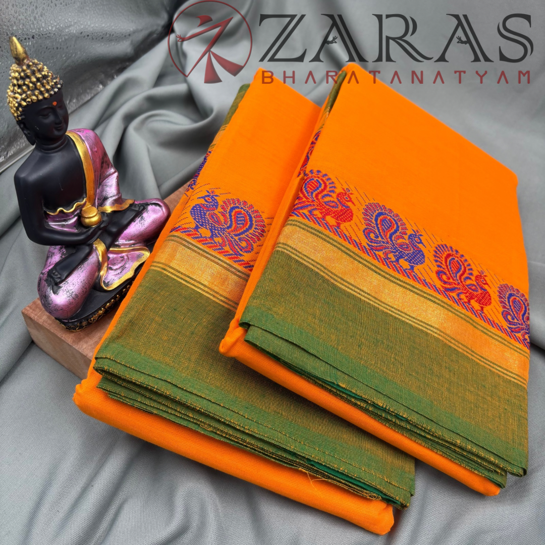 Peacock dance practice sarees are all-time best sellers for their attractive design. The rich border is lined up with motifs of peacocks, followed by a golden zari and a contrast plain border, giving the border a grand and rich aesthetic look. It comes in various colour combinations like red with blue border along with golden and blue coloured peacock motifs, red with green, yellow with red, etc.