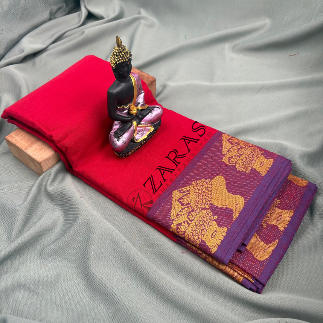 Chilanka motif dance sarees are unique and traditional practice sarees, which are crafted with the design of the beautiful feet of a dancer, adorned with chilanka. The indultion of alta designs, the border of the pyjama, adds more grace to the sarees.