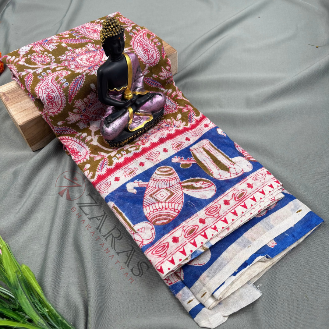 Dance practice sarees are an essential part of a dancer’s life, independent of the dance form, particularly Bharatanatyam, Kuchipudi, Mohiniyattam, and others. From practice space to final rehearsals, a dance saree travels along with a female dancer. The artist’s comfort from the breathable, sweat-absorbing cotton fabric allows the dancer to move with flexibility while also being the greatest partner for long hours of sweating and practice.