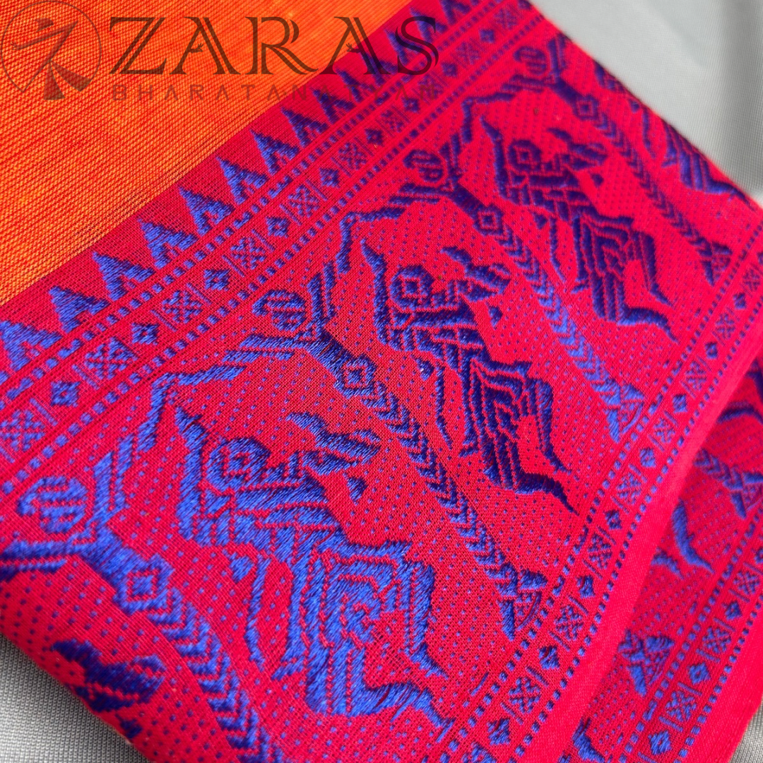 The exquisite design of dancing doll sarees embodies the beauty of traditional dance. The border’s elaborate patterns of pillars and a dancing girl enhance the dance’s beauty and the dancer’s elegance. This is recommended for both practice sessions and final-stage rehearsals.