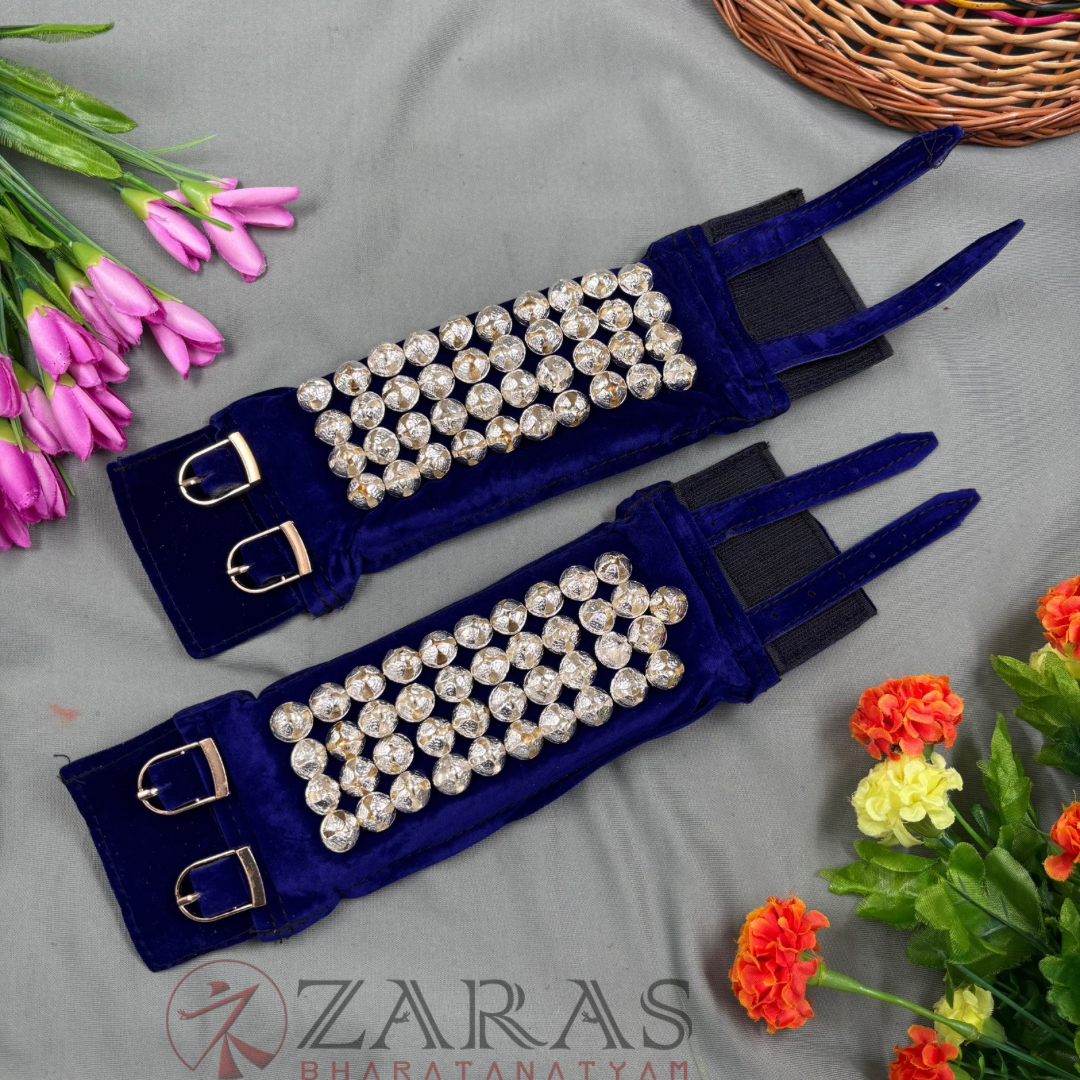 Bharatanatyam Dance Salangai 4 Line (Ankle Bells) Made of Velvet (Blue) SILVER POLISHED