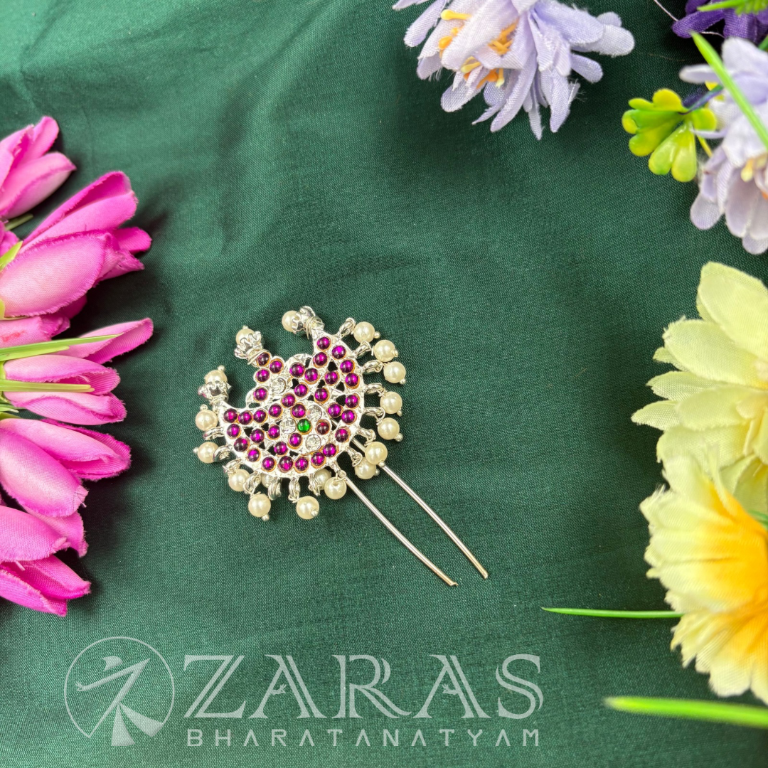 NThe head arch used in Bharatanatyam holds deep spiritual, cultural, and aesthetic significance. It is one of the head accessories. The hair is beautifully braided with false hair with a hair ring on the top, then beautifully adorned with flowers, jadai set and kunjalam and the head arch is placed above the hair ring at the top. It gives a complete look.