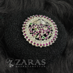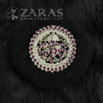 From simple elegant pieces to beautiful traditional pieces, Zaras has an absolutely stunning collection of Rakodi. The varieties include Goddess Lakshmi-inspired rakodi, layered with maroon and green kemp stones and white stones. An intricate carving of Goddess Lakshmi, sitting on the lotus, showing varada hasta and her devotees nearby, in golden foil is placed in the centre.