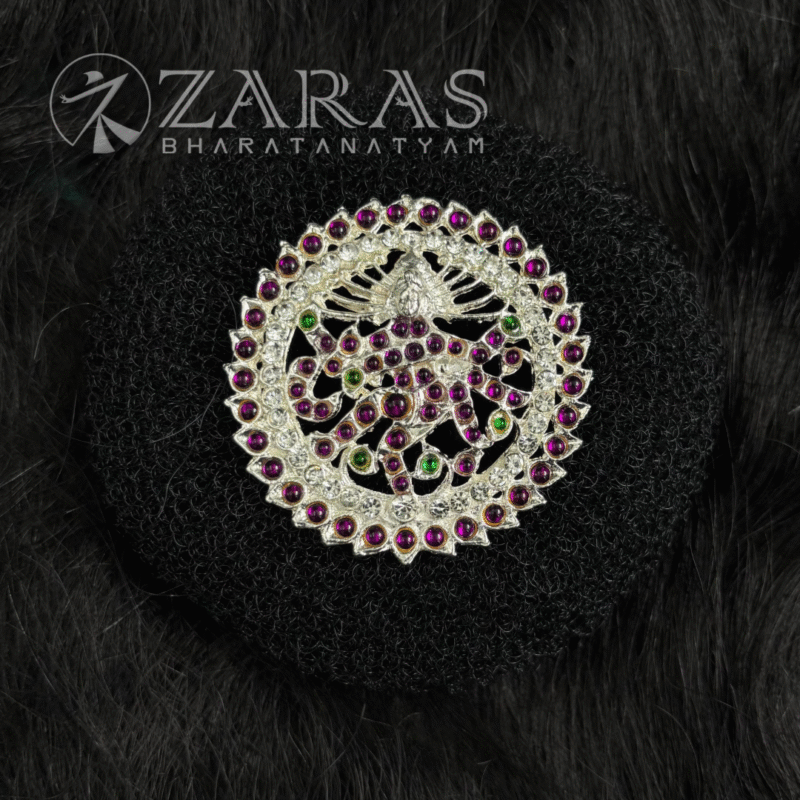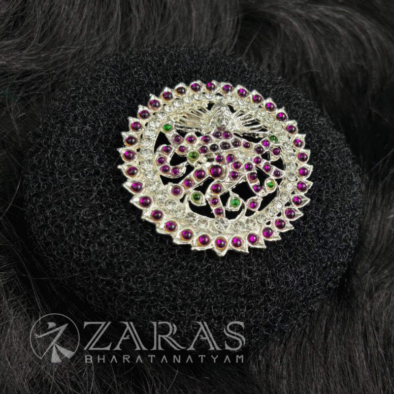 A rakodi is a hair ornament worn by female Bharatanatyam dancers. The rakodi is positioned above a hair ring that is used to secure all of the hair at the top. Despite being a tiny, one-piece ornament, it is just as essential as the others. Flowers are tied around the hair