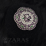 From simple elegant pieces to beautiful traditional pieces, Zaras has an absolutely stunning collection of Rakodi. The varieties include Goddess Lakshmi-inspired rakodi, layered with maroon and green kemp stones and white stones. An intricate carving of Goddess Lakshmi, sitting on the lotus, showing varada hasta and her devotees nearby, in golden foil is placed in the centre.