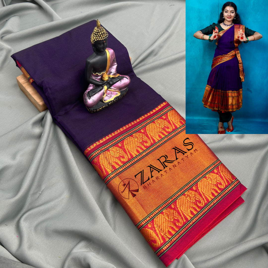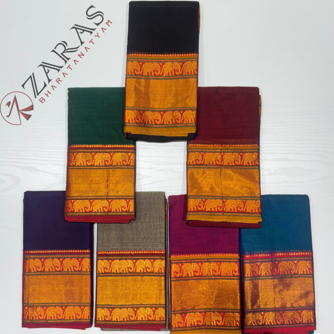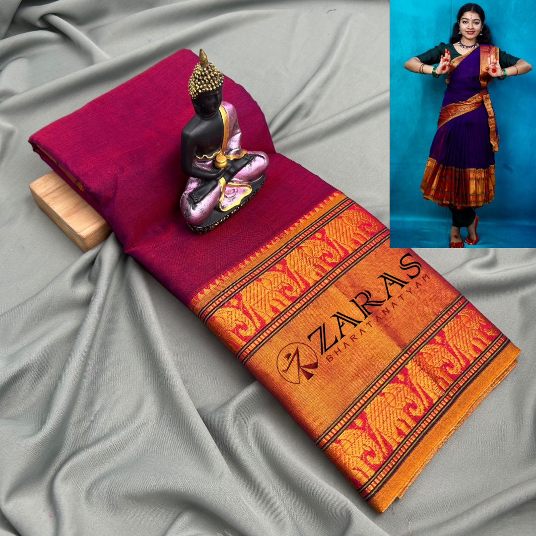 Explore Zara’s online collection, featuring an array of custom and ready-made Bharatanatyam cotton dance practice sarees.